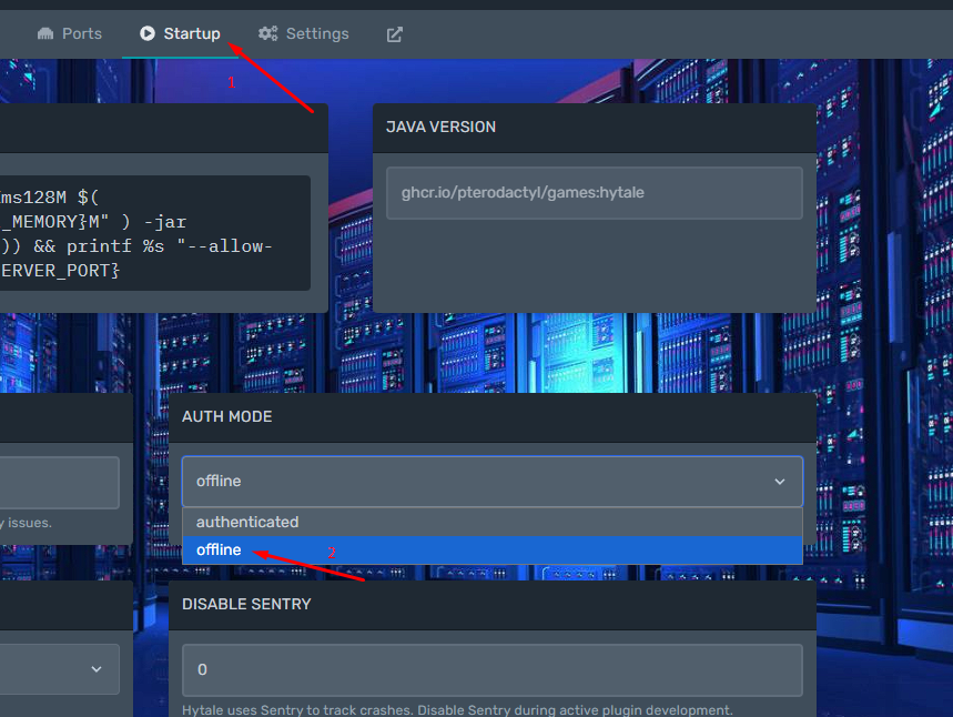3. Сега ще се отвори конзолата на сървъра. Първо трябва да смените authentication mode-a на offline. Това става като цъкнете на меню Startup и след това от менюто по-долу да изберете offline опцията.